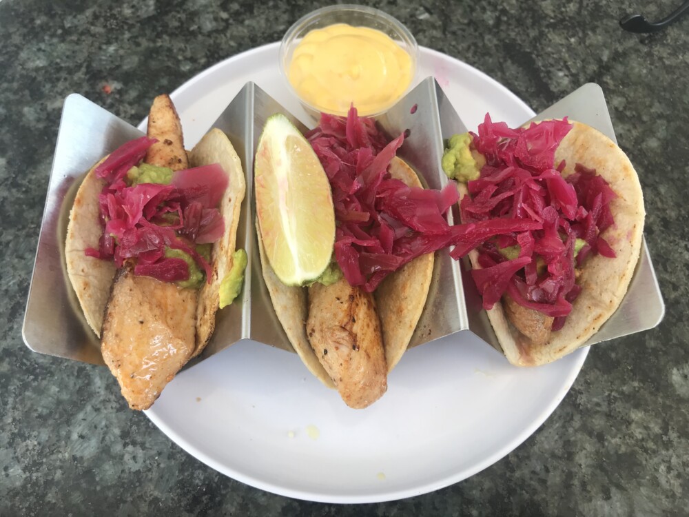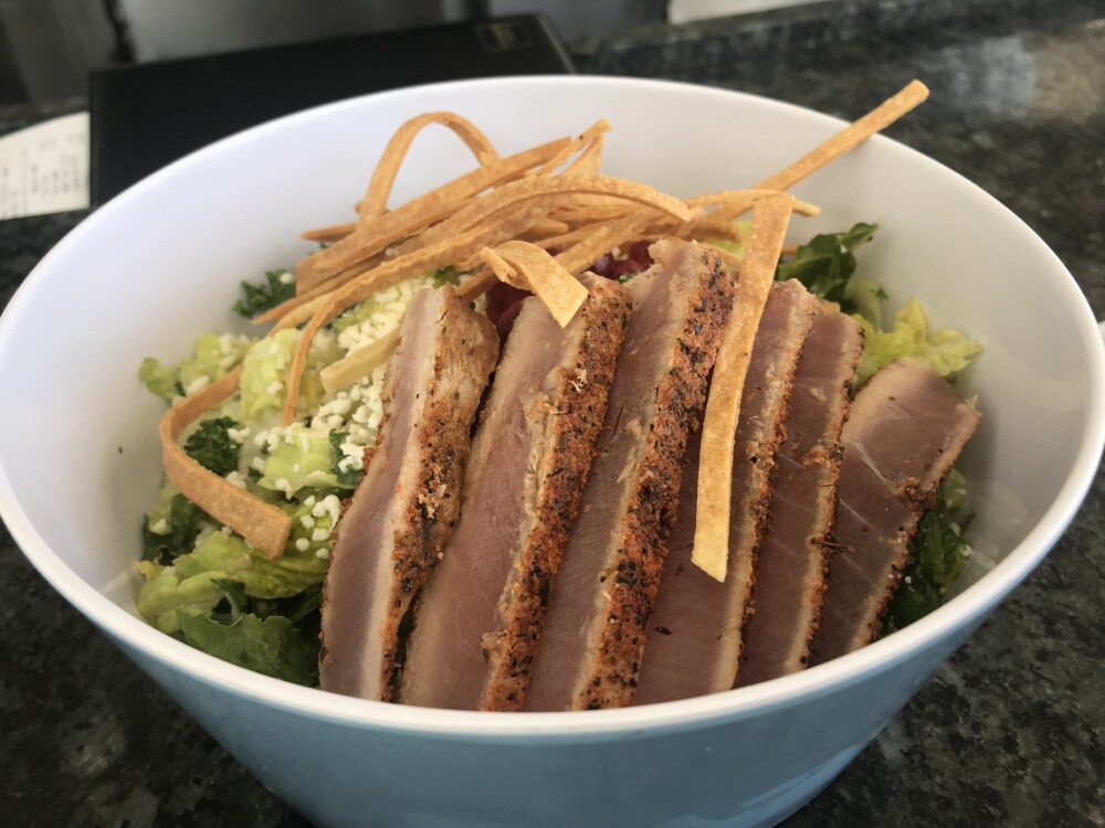 We spent the rest of the day lounging by the pool, refreshing cocktails in hand from Playa, the poolside, beachfront bar and restaurant featuring a variety of dishes along with a traditional rum and tequila bar. We had a little alfresco lunch at the bar too — grilled fish tacos for me (didn’t eat the tortilla) and Caesar salad with tuna for Roger.