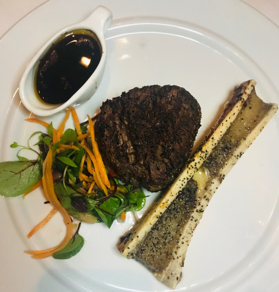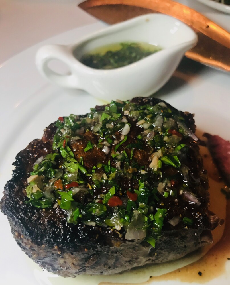Pro-tip: At Diplomat Prime, let your servers guide you through the wine list. Their suggestions are always on point with whatever you are ordering. I started off with super fresh and delicious jumbo lump crab cocktail and Roger got the local burrata and caviar with uni and roasted tomato puree. For our entrées, it was all about the filet. I kept things simple with chimichurri sauce and a side of roasted mushrooms. Roger went super rich and decadent and added roasted bone marrow to his, along with a bordelaise sauce and a side of creamed spinach. Our glasses of Pali Wine Company Alphabets Pinot Noir, recommended by our server, paired absolutely perfectly.